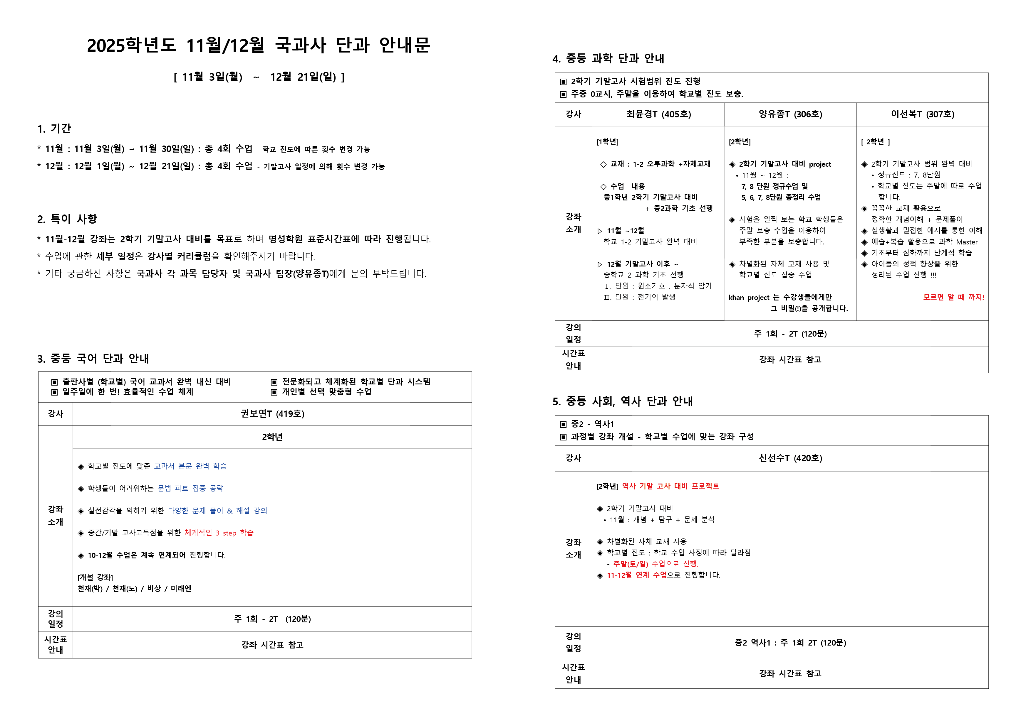 중등 2025학년도 11-12월 국과사 단과 안내문 페이지 정보 작성자 최고관리자 댓글 0건 조회 96회 작성일 25-10-31 16:12 목록 본문 이전글★ 명성 예비고1 국어ㆍ과학ㆍ한국사ㆍ통합사회 단과 11월 6일 개강안내★ 25.10.31 다음글2025학년도 11-12월 국과사 단과 25.10.31 댓글 0 댓글목록 등록된 댓글이 없습니다.