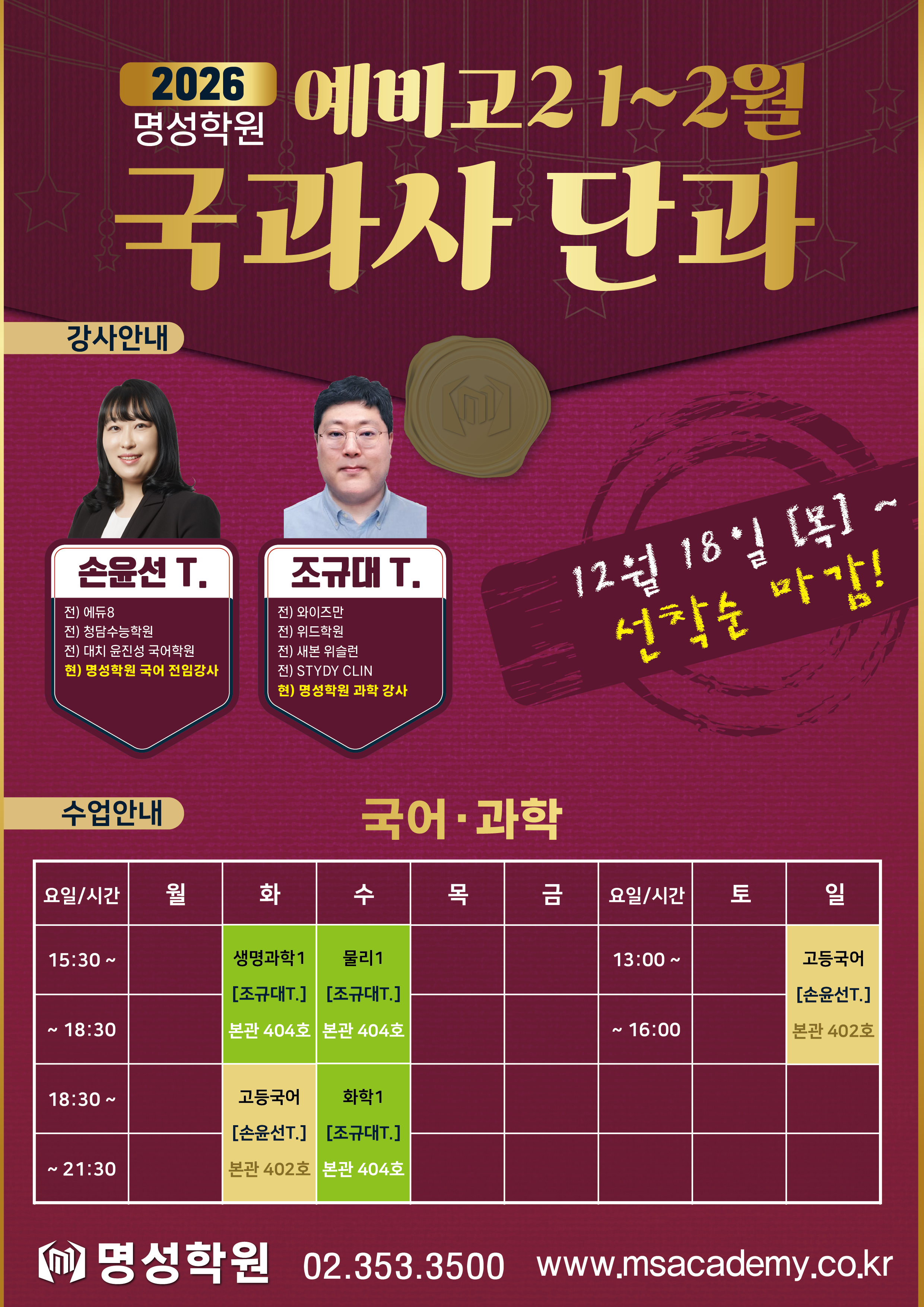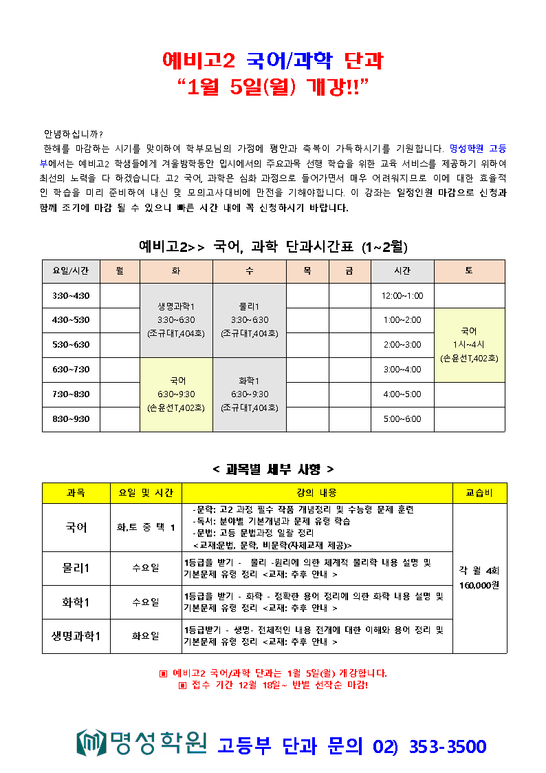 고등 ★명성 예비고2 국어ㆍ과학 단과 1월 5일 개강안내★ 페이지 정보 작성자 최고관리자 댓글 0건 조회 257회 작성일 25-12-15 20:53 목록 본문 이전글★명성 예비고3 국어ㆍ과학 단과 1월 5일 개강안내★ 25.12.15 다음글★명성 예비고1 국어ㆍ과학 단과 1월 5일 개강안내★ 25.12.15 댓글 0 댓글목록 등록된 댓글이 없습니다.