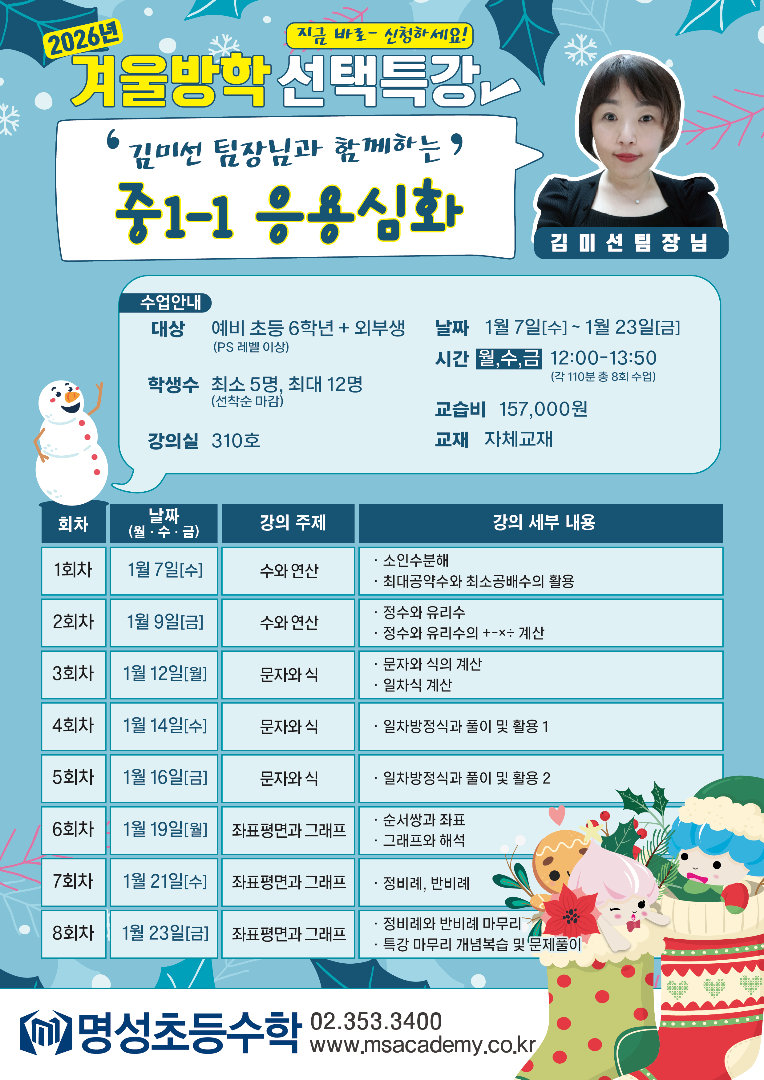 초등 초등 1월 겨울방학 선택특강 [김미선 팀장님] 페이지 정보 작성자 최고관리자 댓글 0건 조회 75회 작성일 25-12-16 16:37 목록 본문 이전글초등 1월 겨울방학 선택특강 [심보현 T.] 25.12.16 다음글★명성 예비고3 국어ㆍ과학 단과 1월 5일 개강안내★ 25.12.15 댓글 0 댓글목록 등록된 댓글이 없습니다.
