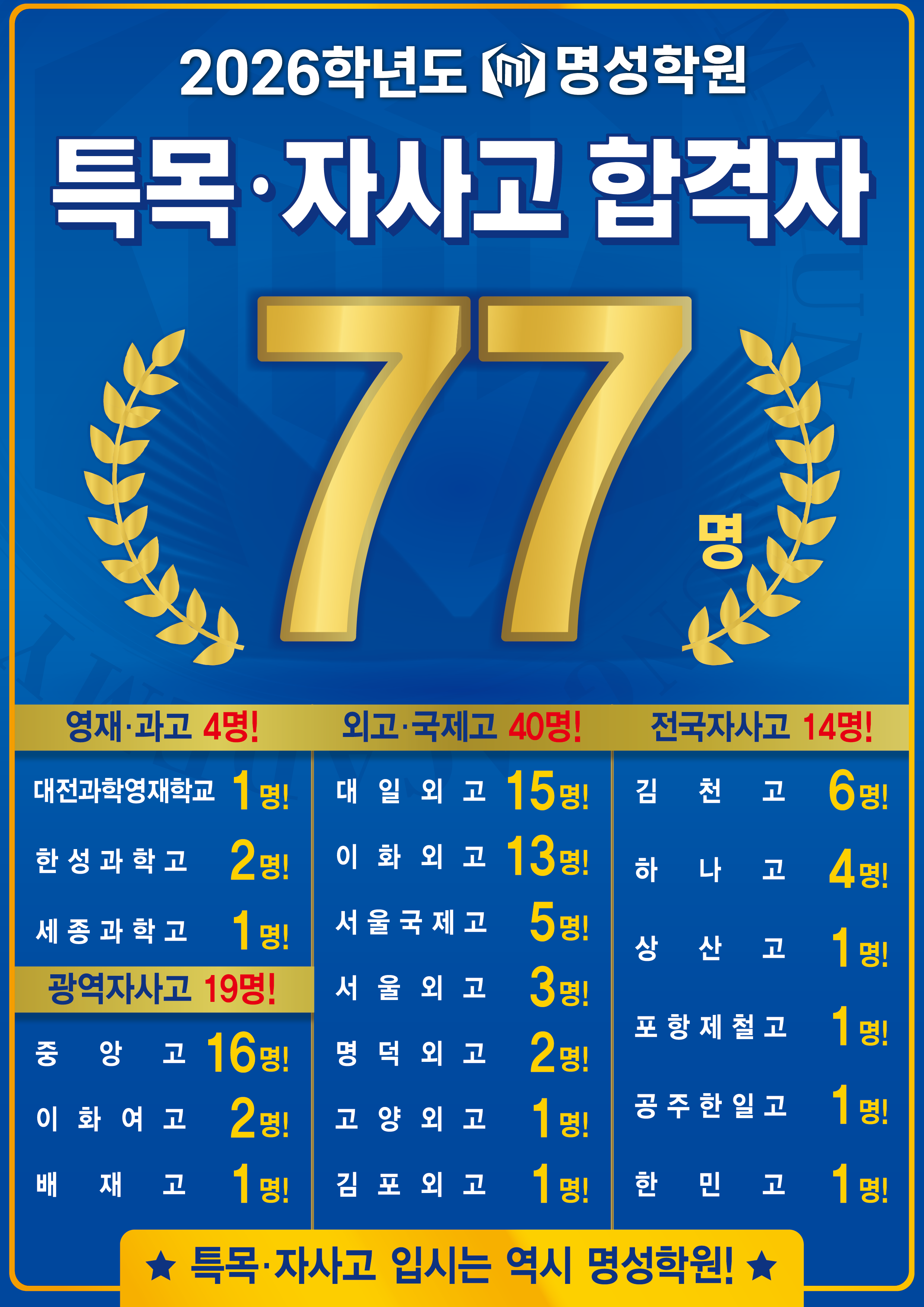 중등 ★ 2026 특목·자사고 합격자 ★ 페이지 정보 작성자 최고관리자 댓글 0건 조회 76회 작성일 26-01-29 21:22 목록 본문 이전글★ 2025 2학기 기말고사 성적우수자 ★ 26.01.30 다음글명성학원 예비중3 특목입시논술반 개강 26.01.06 댓글 0 댓글목록 등록된 댓글이 없습니다.