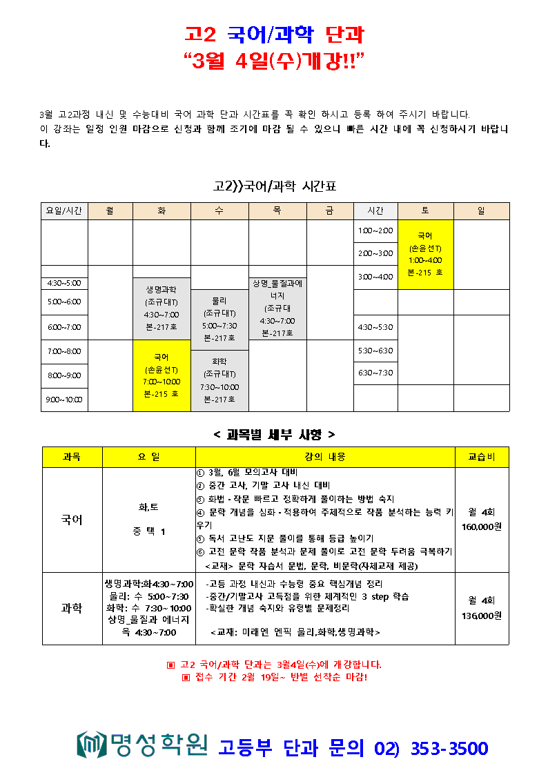 고등 고2 3월 국어과학 단과 개강 안내 페이지 정보 작성자 최고관리자 댓글 0건 조회 179회 작성일 26-02-12 18:46 목록 본문 이전글고3 3월 국어과학 단과 개강 안내 26.02.12 다음글고1 3월 국어과학 단과 개강 안내 26.02.12 댓글 0 댓글목록 등록된 댓글이 없습니다.