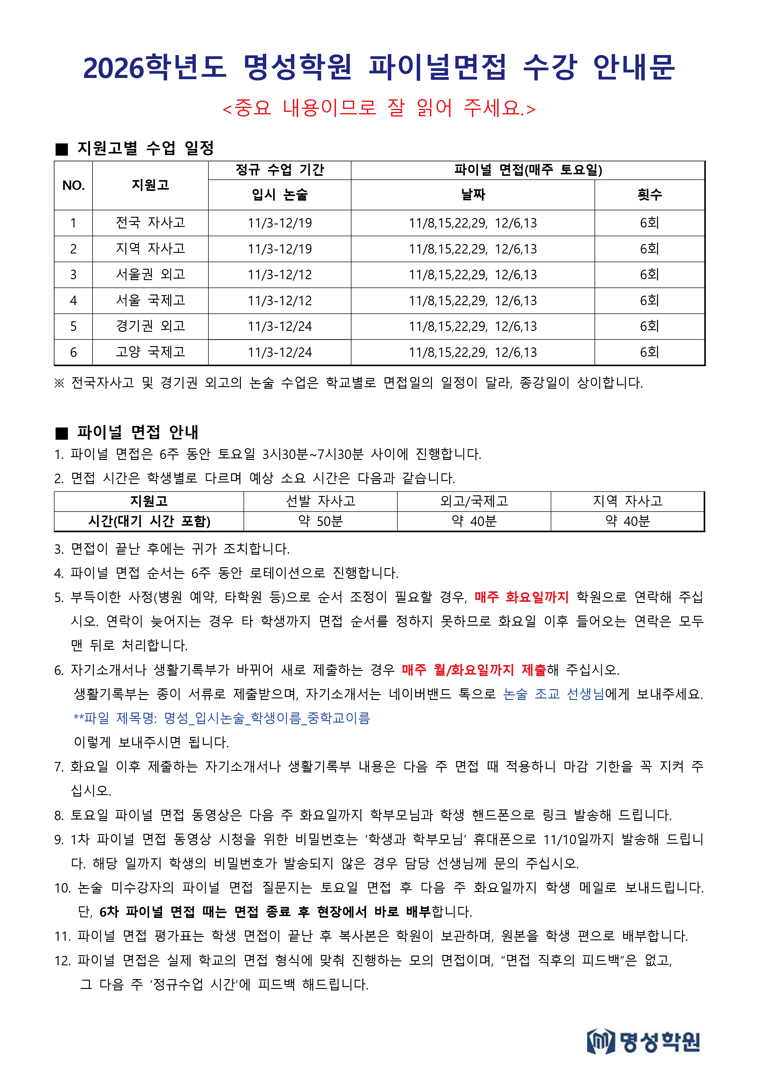 중등 2025_파이널면접수강안내문_외고,국제고,자사고 페이지 정보 작성자 최고관리자 댓글 0건 조회 210회 작성일 25-10-24 21:40 목록 게시판 리스트 옵션 검색 본문 이전글명성 11월 한국사+통합사회 특강 개강! 25.10.29 다음글특목 입시 대비반 독서 프로그램 토요일반 [김희준T.] 25.08.21 댓글 0 댓글목록 등록된 댓글이 없습니다.