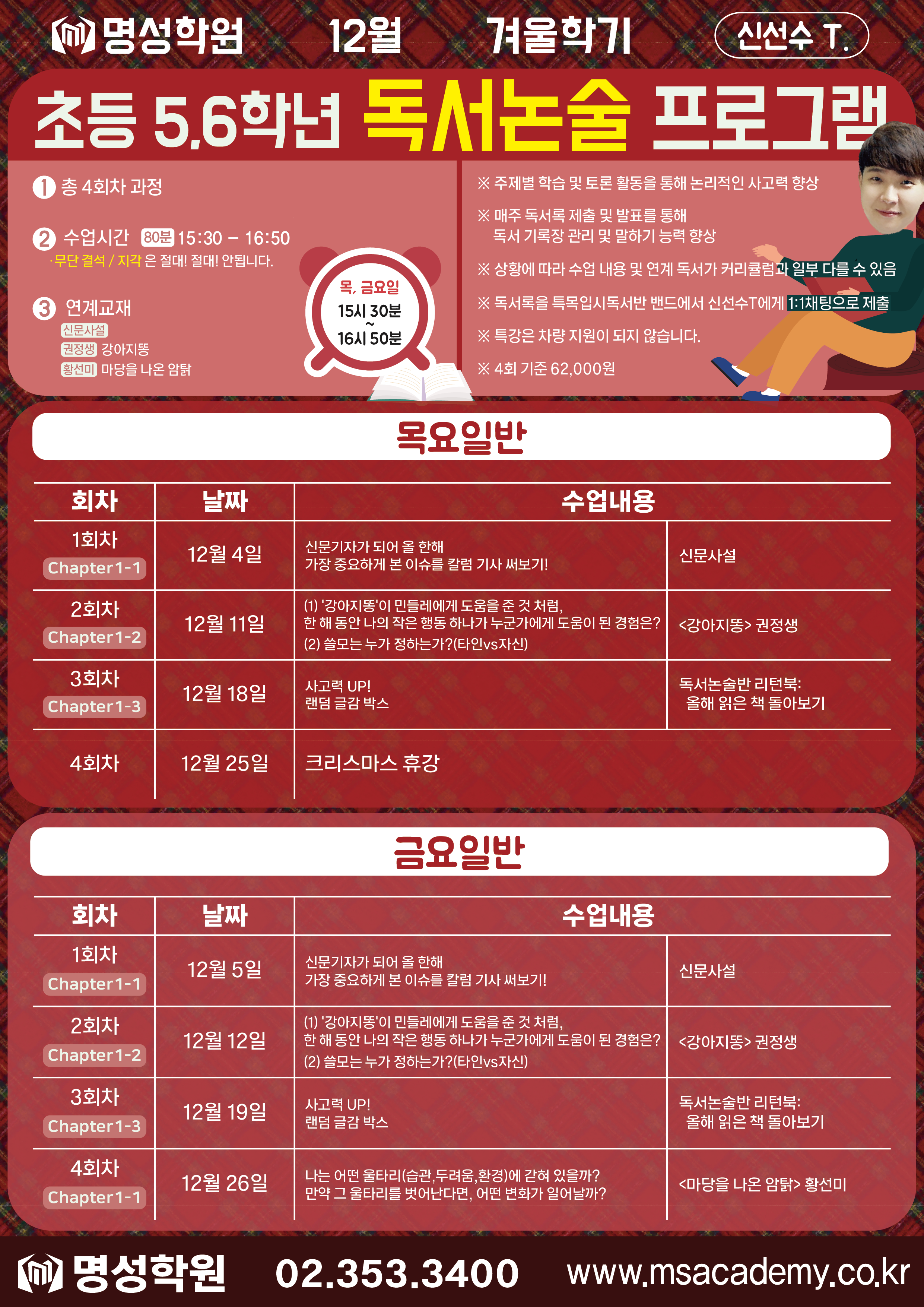 초등 초등 12월 겨울학기 논술 프로그램[신선수T.] 페이지 정보 작성자 최고관리자 댓글 0건 조회 62회 작성일 25-11-19 20:54 목록 게시판 리스트 옵션 검색 본문 이전글명성학원 11월 29일 예비중1 학부모 간담회 25.11.24 다음글초등 12월 겨울학기 과학 프로그램 [이선복T.] 25.11.19 댓글 0 댓글목록 등록된 댓글이 없습니다.