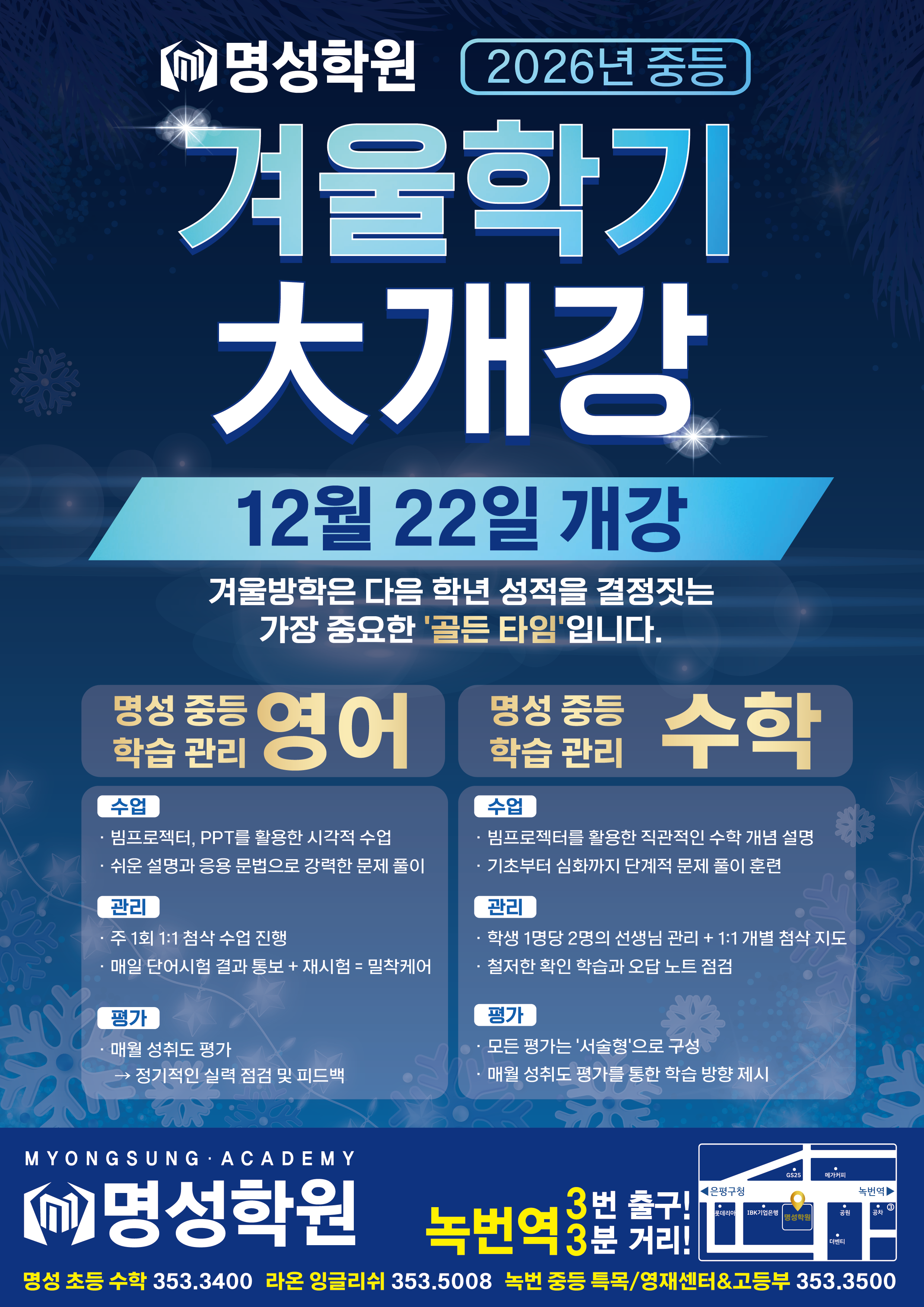 중등 ★ 명성학원 2026년 중등부 겨울학기 大개강 ★ 페이지 정보 작성자 최고관리자 댓글 0건 조회 59회 작성일 25-12-04 22:02 목록 본문 이전글2026 윈터스쿨 끝장반 수학 개강! 25.12.04 다음글★명성학원 26학년도 영재, 과고 합격자★ 25.12.03 댓글 0 댓글목록 등록된 댓글이 없습니다.
