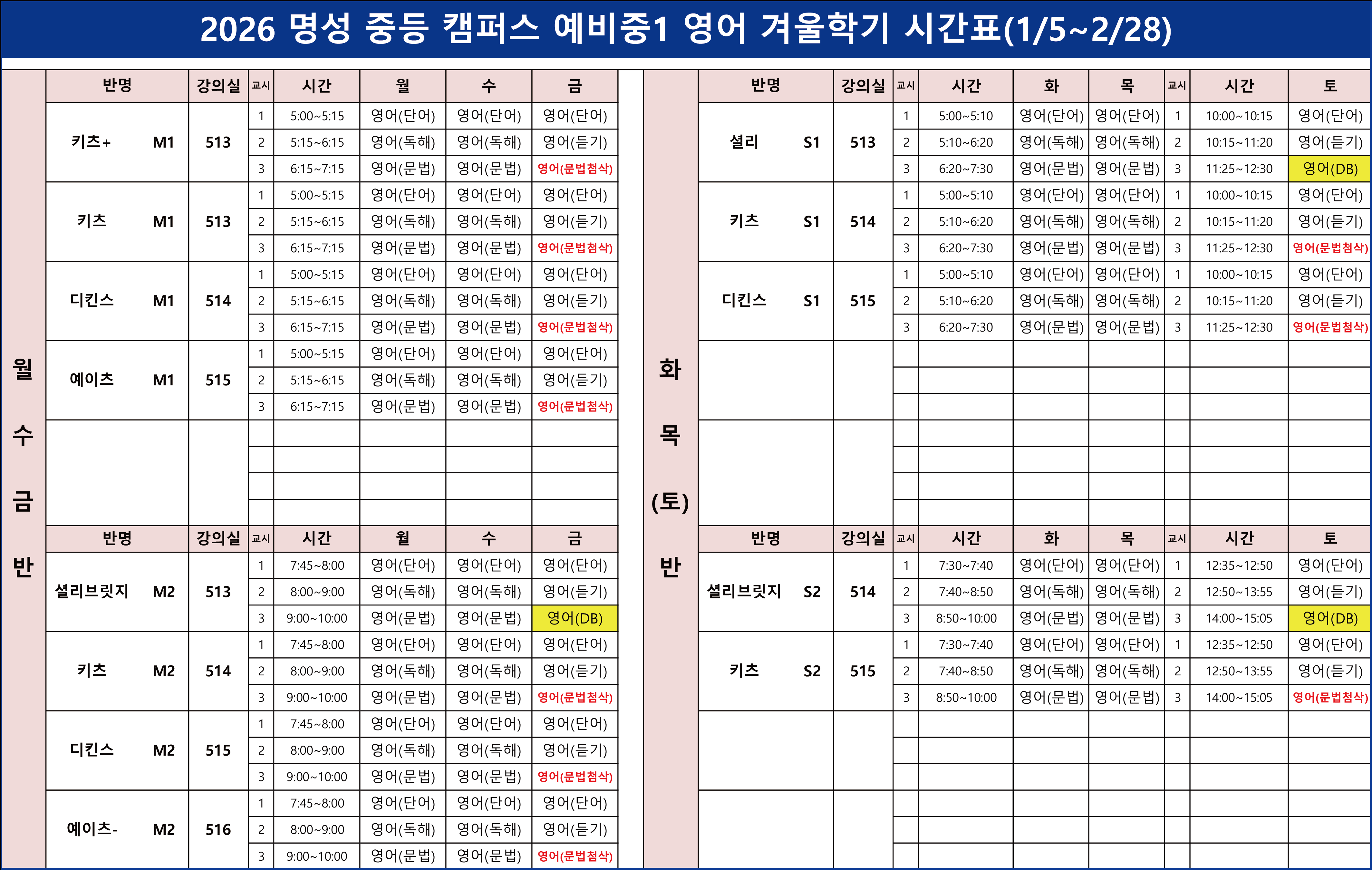중등 예비중1 영어 겨울학기 시간표(1/5~2/28) 페이지 정보 작성자 최고관리자 댓글 0건 조회 27회 작성일 25-12-29 20:11 목록 본문 이전글고등부 수학 겨울방학특강 [확률과 통계 / 홍건T.] 25.12.30 다음글명성학원 예비중1,2 논술반 개강 25.12.29 댓글 0 댓글목록 등록된 댓글이 없습니다.