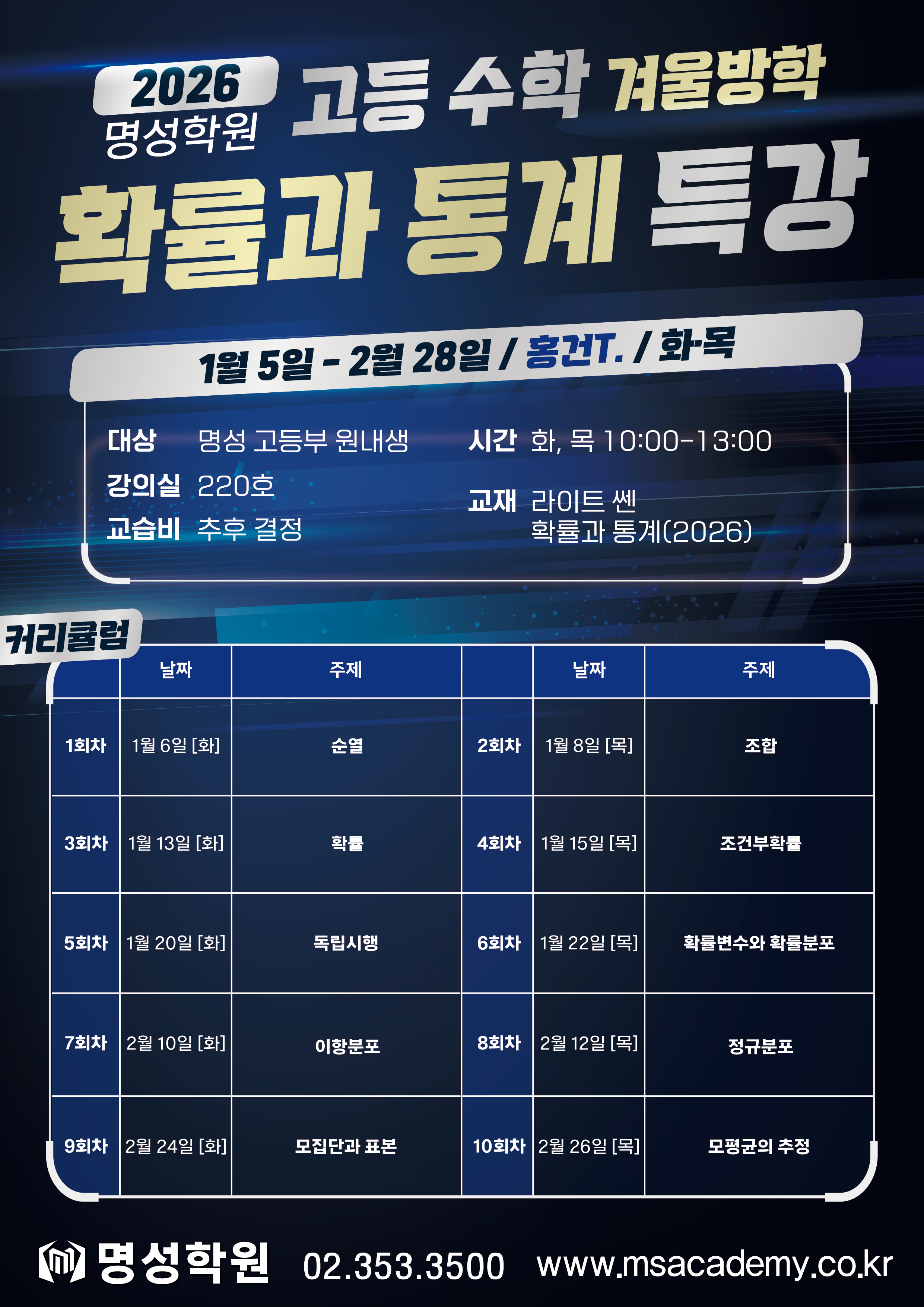 고등 고등부 수학 겨울방학특강 [확률과 통계 / 홍건T.] 페이지 정보 작성자 최고관리자 댓글 0건 조회 12회 작성일 25-12-30 21:53 목록 본문 이전글고등부 수학 겨울방학특강 [미적분 / 홍건T.] 25.12.30 다음글예비중1 영어 겨울학기 시간표(1/5~2/28) 25.12.29 댓글 0 댓글목록 등록된 댓글이 없습니다.