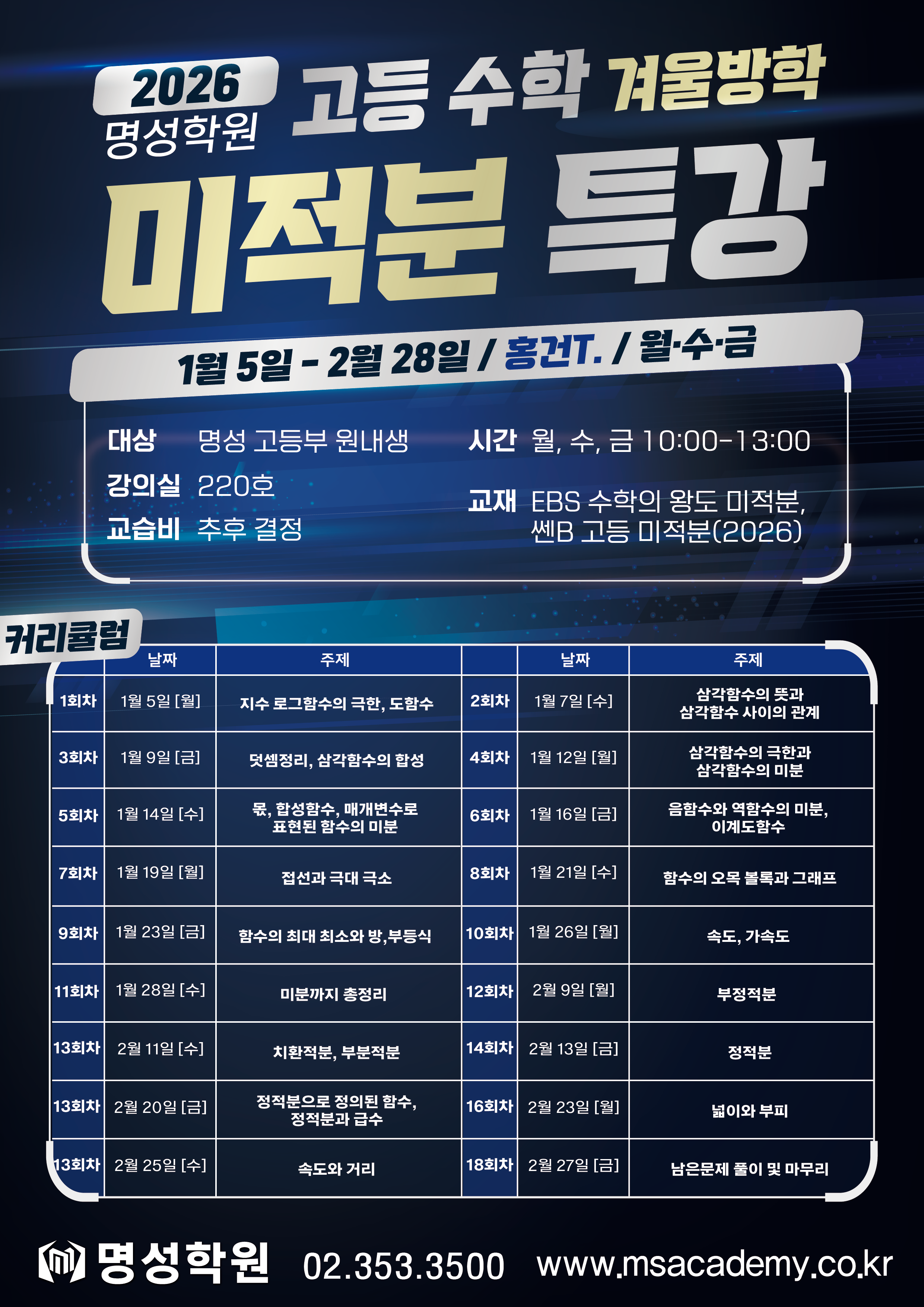 고등 고등부 수학 겨울방학특강 [미적분 / 홍건T.] 페이지 정보 작성자 최고관리자 댓글 0건 조회 12회 작성일 25-12-30 21:55 목록 본문 이전글고등부 수학 겨울방학특강 [대수능 모의고사 / 황유종T.] 25.12.30 다음글고등부 수학 겨울방학특강 [확률과 통계 / 홍건T.] 25.12.30 댓글 0 댓글목록 등록된 댓글이 없습니다.