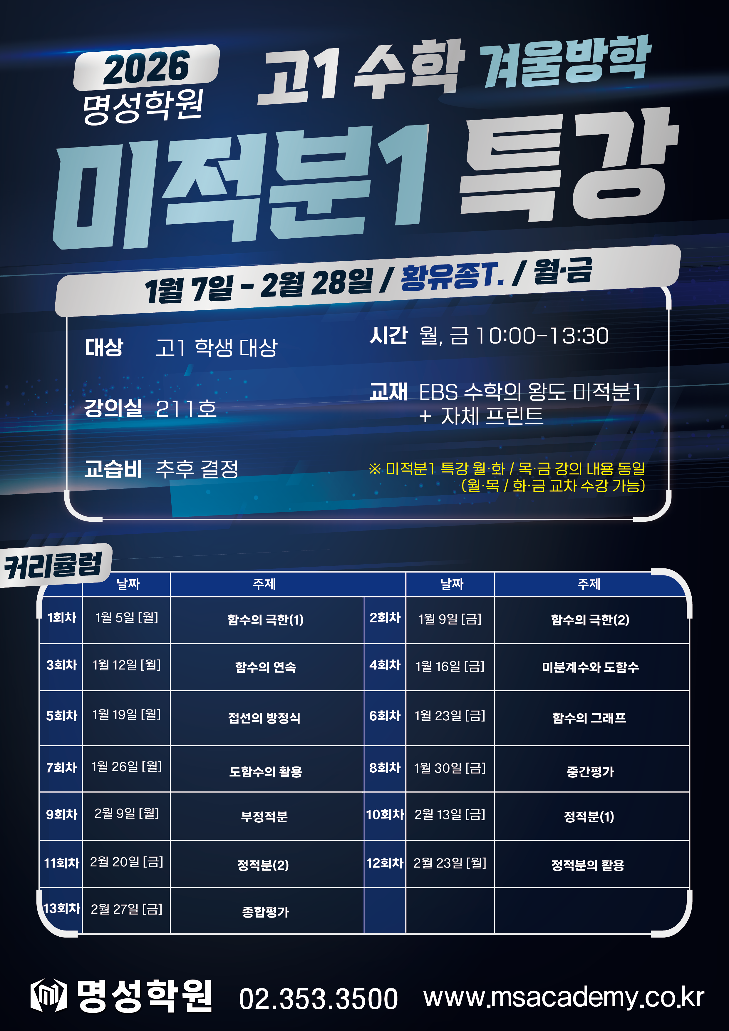 고등 고등부 수학 겨울방학특강 [미적분1 월금 · 화목/ 황유종T.] 페이지 정보 작성자 최고관리자 댓글 0건 조회 10회 작성일 25-12-30 21:57 목록 본문 이전글중등부 영수 윈터특강 [중등수학 고등특강 / 류리라T.] 25.12.30 다음글고등부 수학 겨울방학특강 [대수능 모의고사 / 황유종T.] 25.12.30 댓글 0 댓글목록 등록된 댓글이 없습니다.