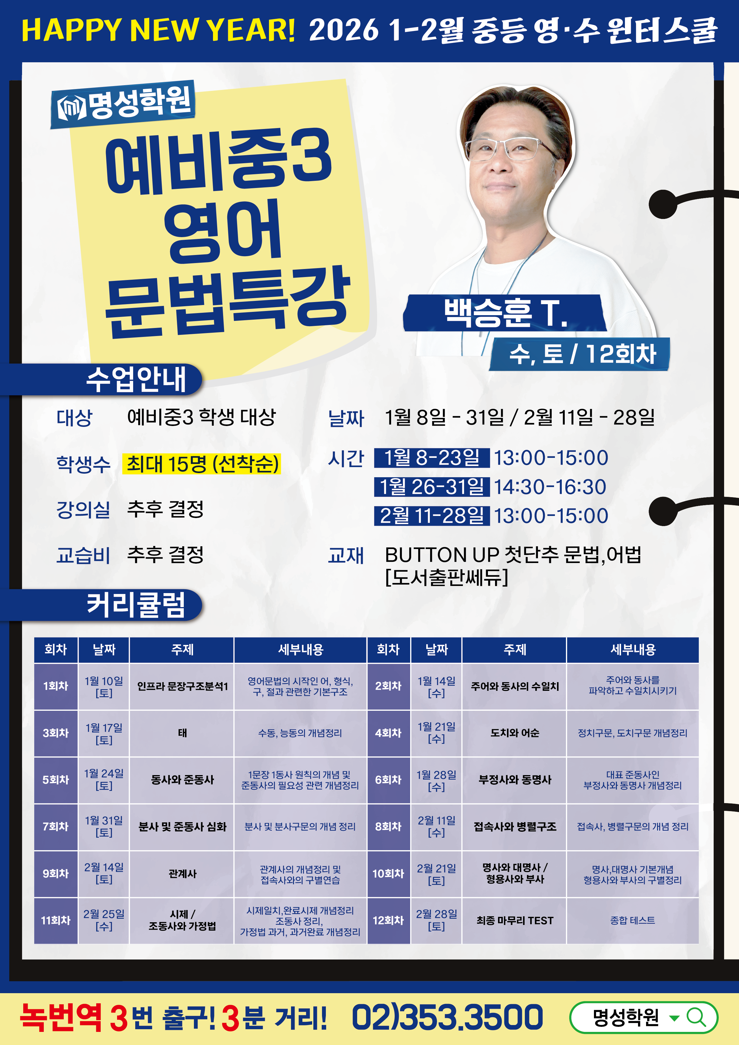 중등 중등부 영수 윈터특강 [예비중3 영어문법 특강 / 백승훈T.] 페이지 정보 작성자 최고관리자 댓글 0건 조회 17회 작성일 25-12-30 22:05 목록 본문 이전글중등부 영수 윈터특강 [예비중2 영어문법 특강 / 양혜정T.] 25.12.30 다음글중등부 영수 윈터특강 [중등수학 2-2 특강 / 최정민T.] 25.12.30 댓글 0 댓글목록 등록된 댓글이 없습니다.