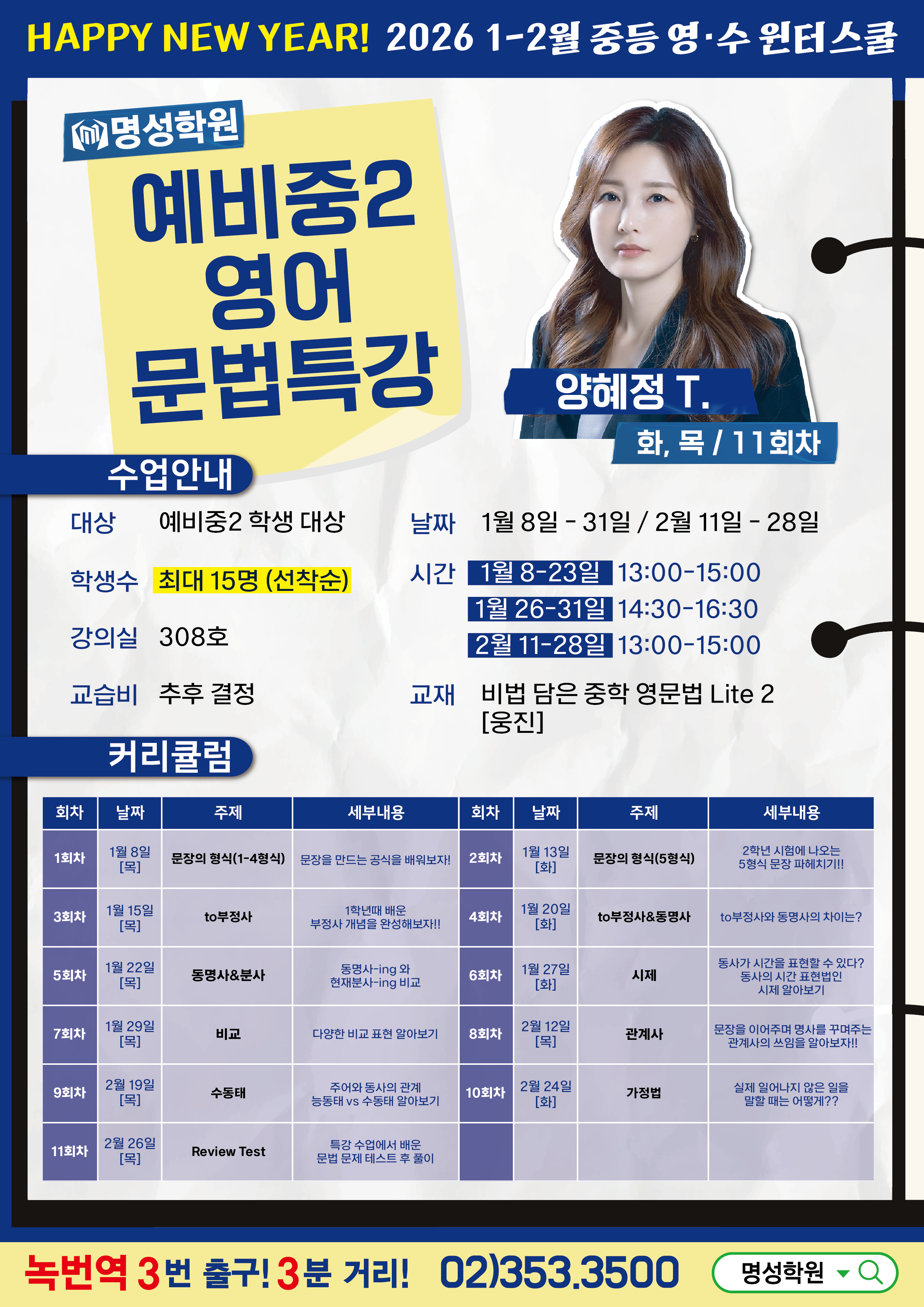 중등 중등부 영수 윈터특강 [예비중2 영어문법 특강 / 양혜정T.] 페이지 정보 작성자 최고관리자 댓글 0건 조회 18회 작성일 25-12-30 22:06 목록 본문 이전글중등부 영수 윈터특강 [예비중1 영어문법 특강 / 이승혁T.] 25.12.30 다음글중등부 영수 윈터특강 [예비중3 영어문법 특강 / 백승훈T.] 25.12.30 댓글 0 댓글목록 등록된 댓글이 없습니다.