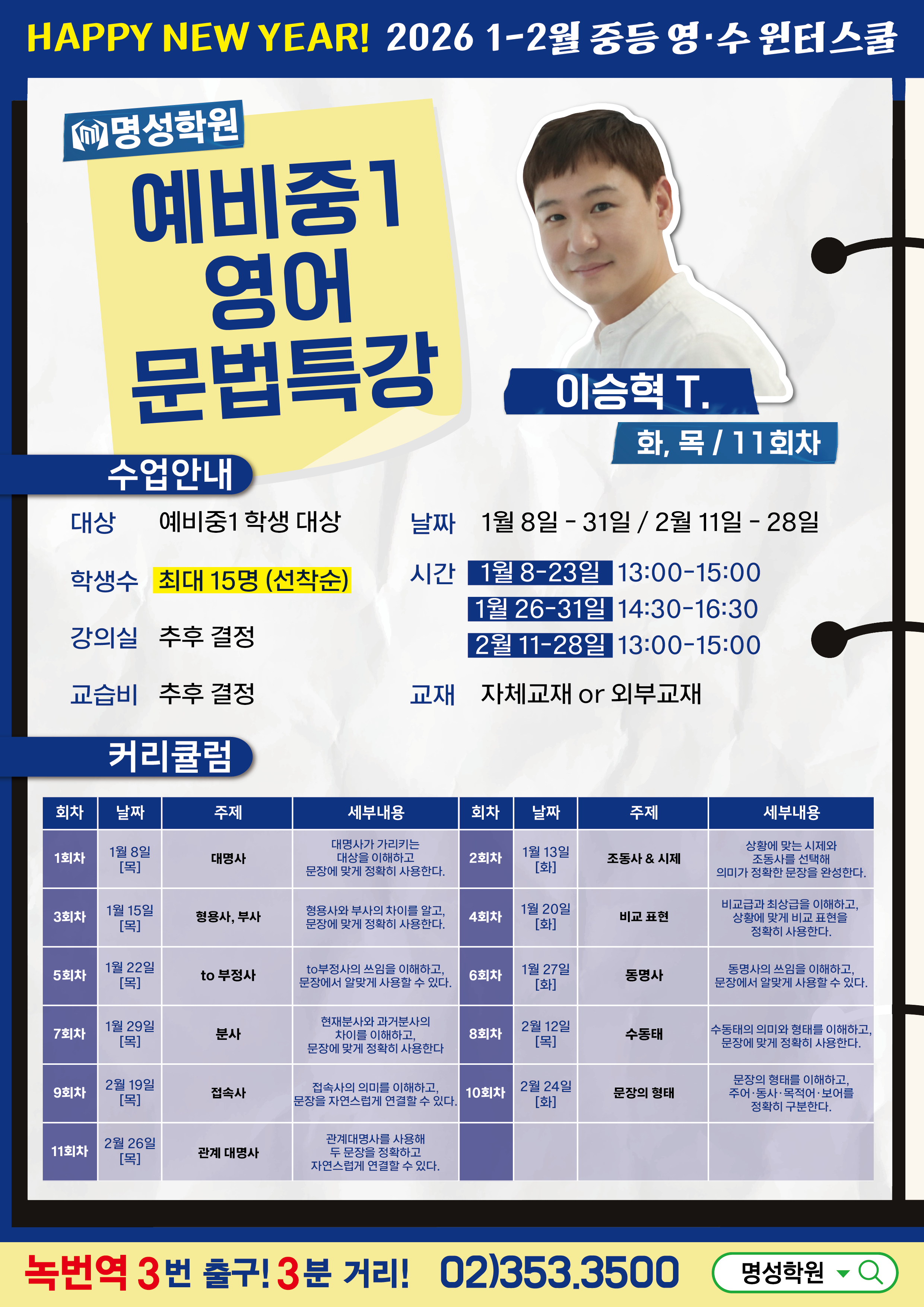 중등 중등부 영수 윈터특강 [예비중1 영어문법 특강 / 이승혁T.] 페이지 정보 작성자 최고관리자 댓글 0건 조회 16회 작성일 25-12-30 22:07 목록 본문 이전글명성 예비고1 윈터스쿨 끝장반 [공통수학2 개념 / 화목] 25.12.30 다음글중등부 영수 윈터특강 [예비중2 영어문법 특강 / 양혜정T.] 25.12.30 댓글 0 댓글목록 등록된 댓글이 없습니다.